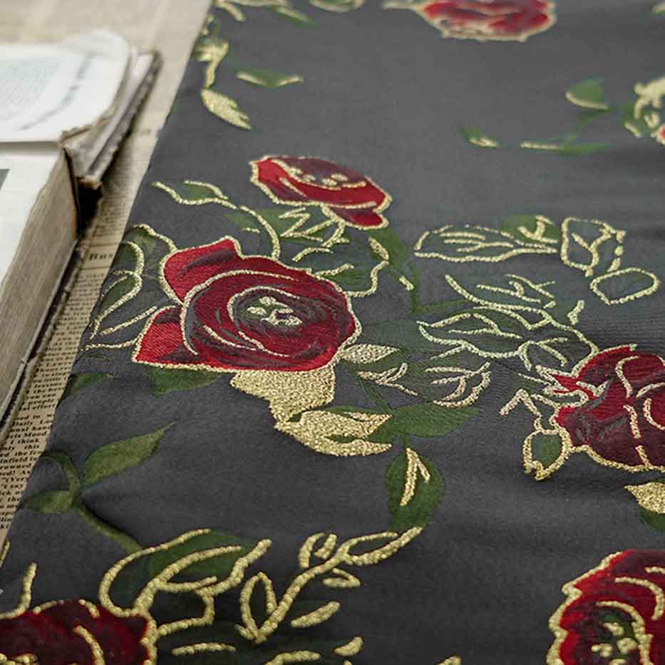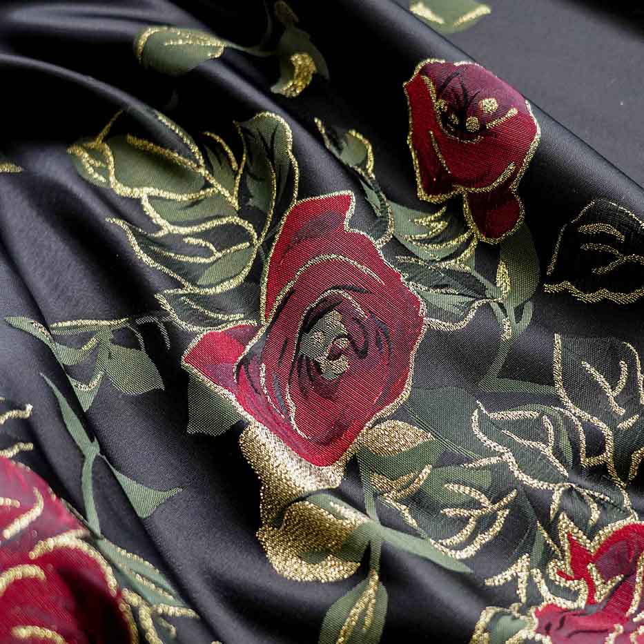 Burgundy rose gold jacquard brocade fabric is a type of fabric that combines the colors burgundy and rose gold in a jacquard brocade design.