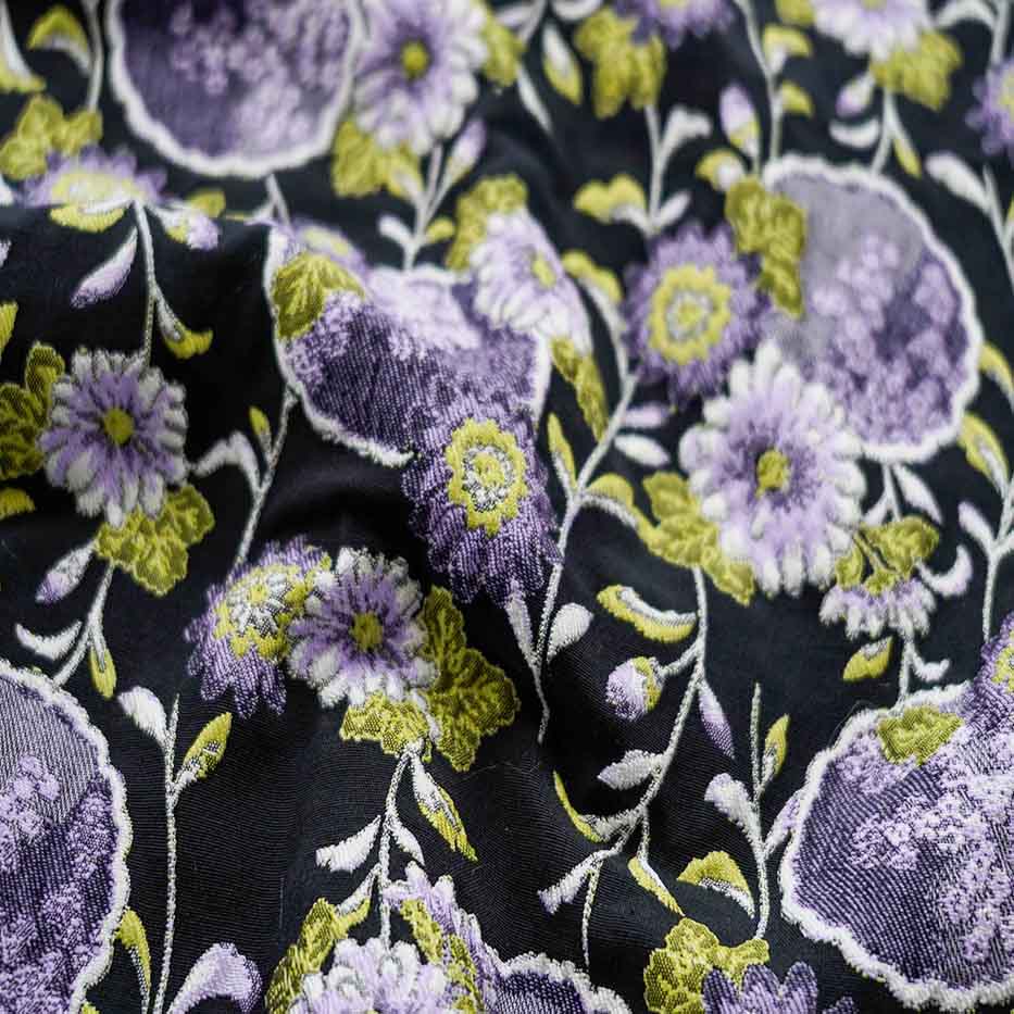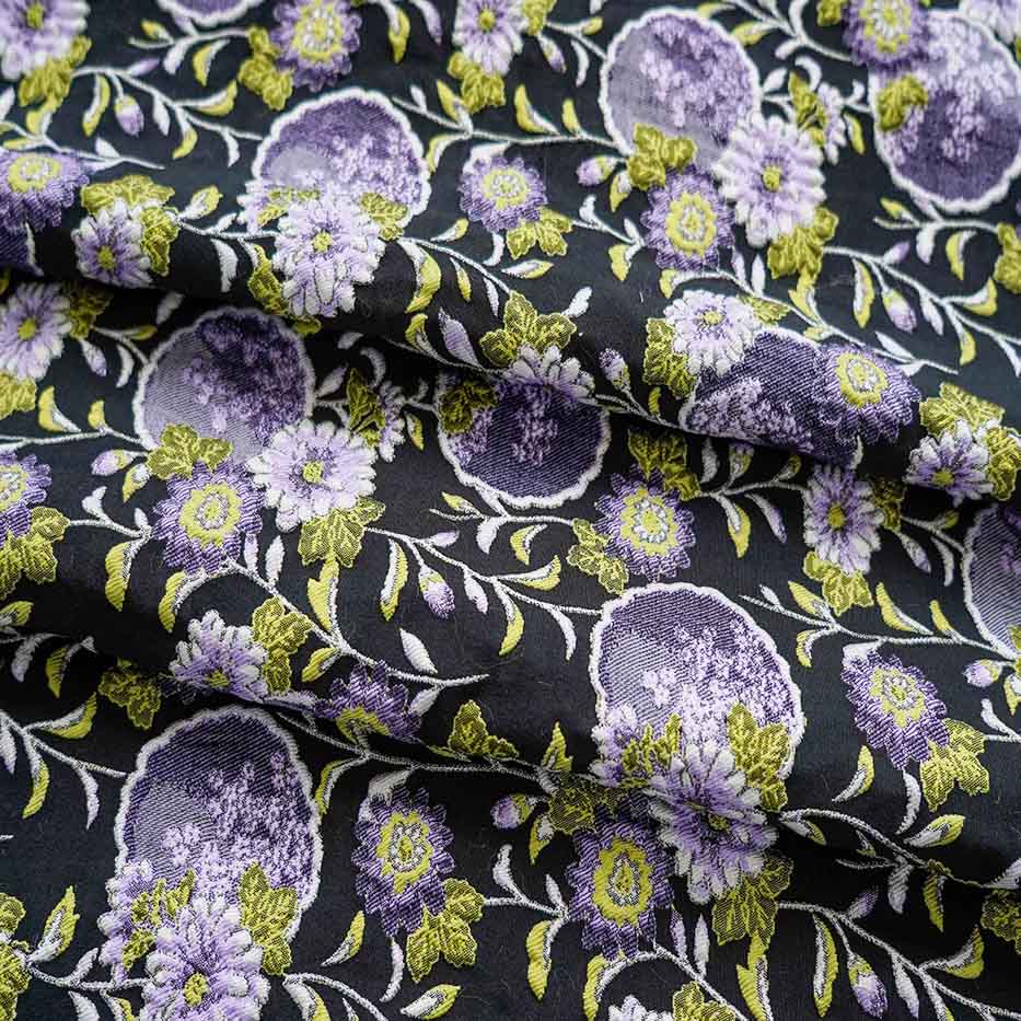 The fabric's design typically features an array of large, intricate flowers in a variety of colors and shades, reminiscent of the lush gardens and grandeur of the French court. The jacquard brocade weaving method creates a raised, textured effect, adding depth and dimension to the floral motifs.