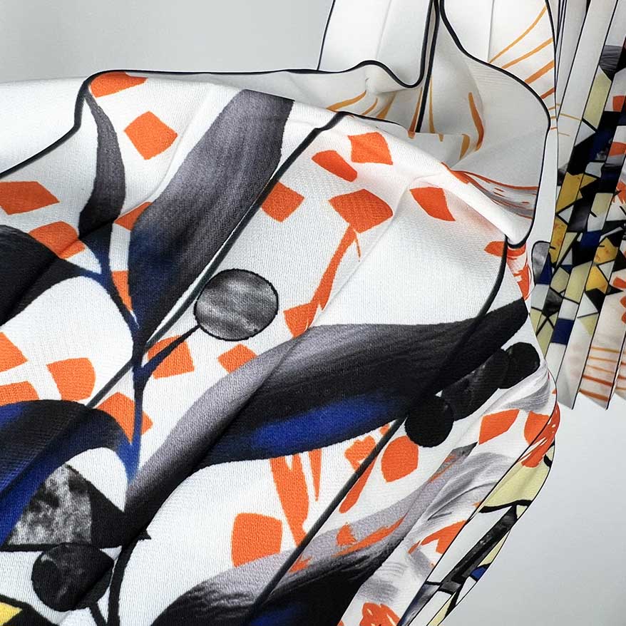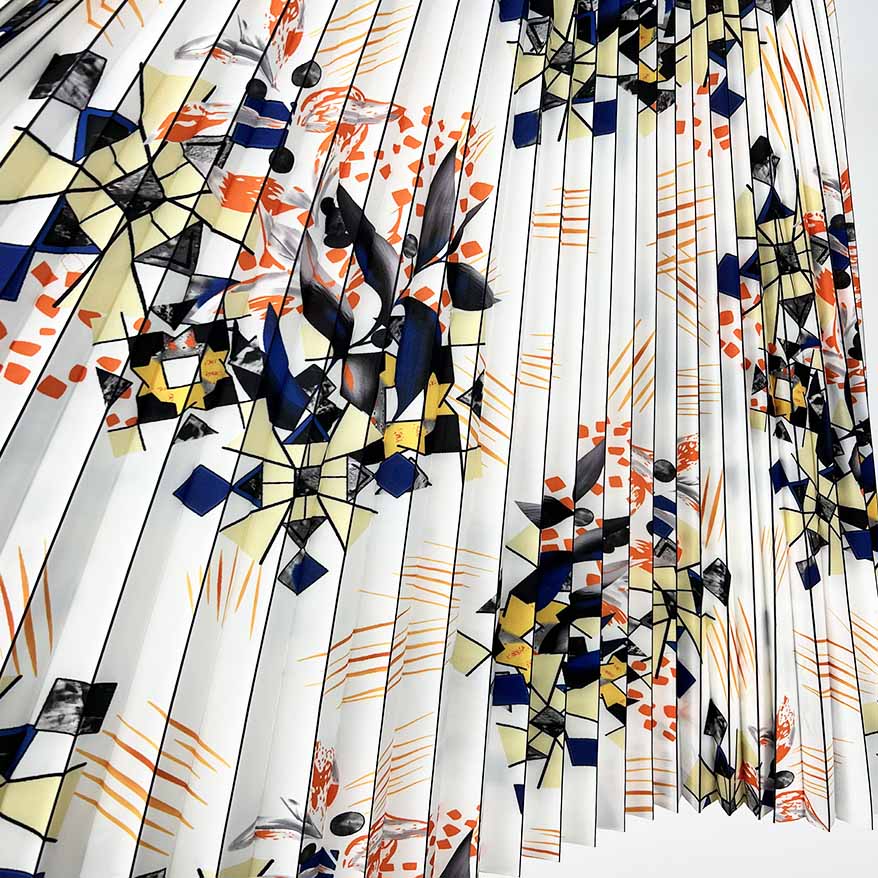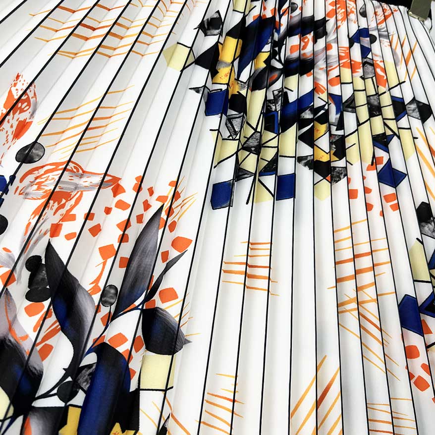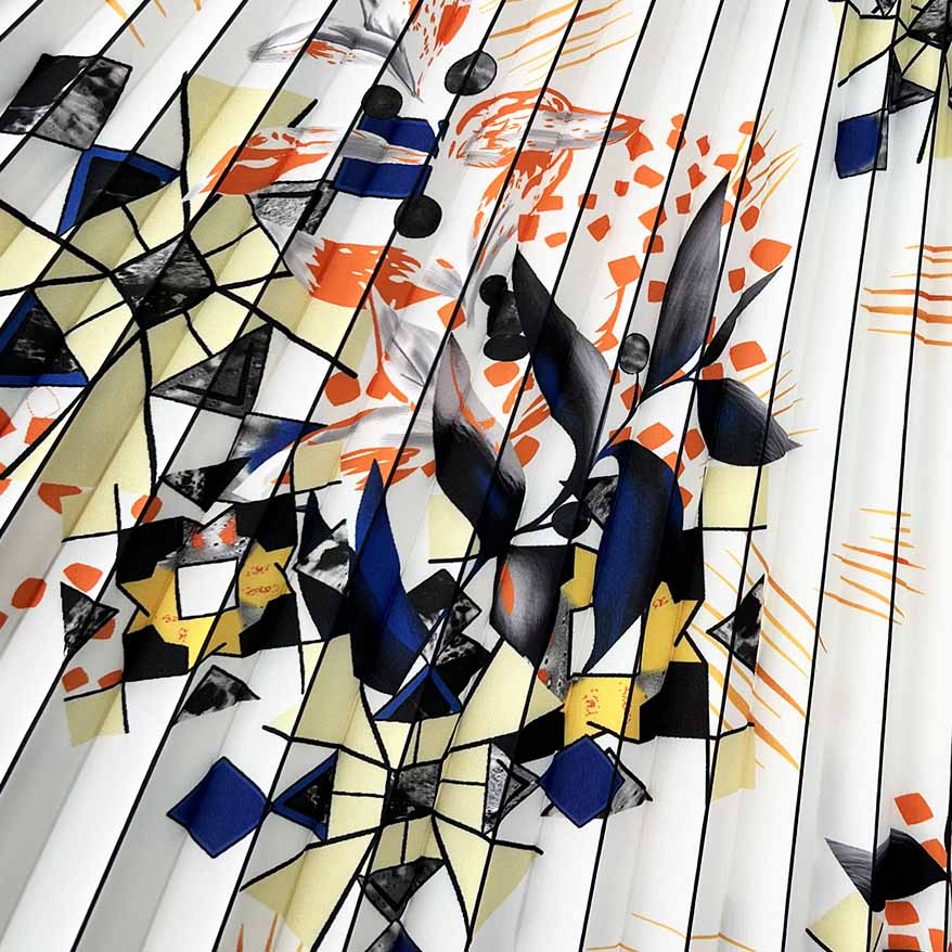 Colorful geometric floral printed chiffon pleated fabric is a vibrant and visually striking textile that combines multiple design elements. Let's break down each component: