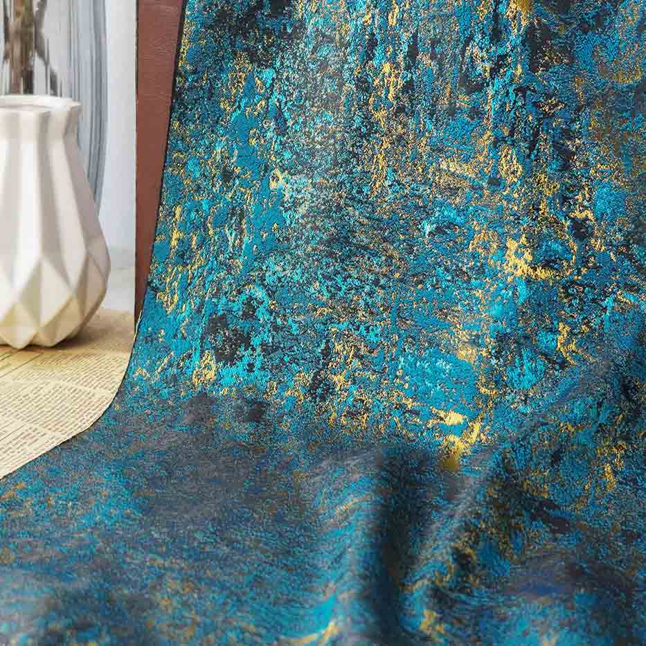 Color: Blue and Gold Contrast The fabric is described as having a contrast between blue and gold. This means that the fabric incorporates both blue and gold hues in its design, likely in a way that creates a visually striking contrast between the two colors.