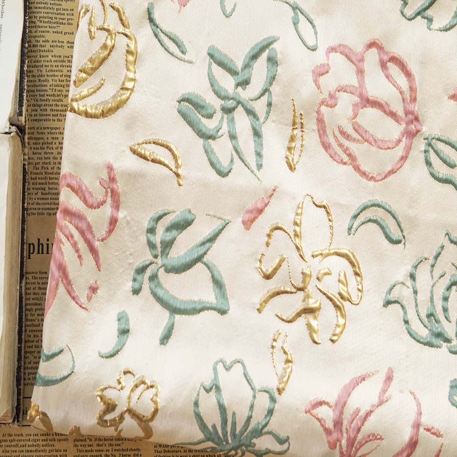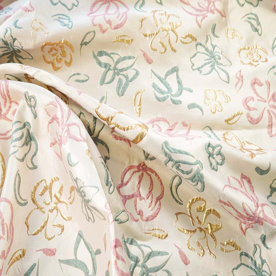 Material: Flower gold embossed jacquard brocade fabric can be made from various materials, including silk, polyester, rayon, or their blends. Silk jacquard brocade is highly desired for its luxurious drape and sheen. Polyester or rayon blends offer more affordable options without compromising the overall elegance and appearance of the fabric.