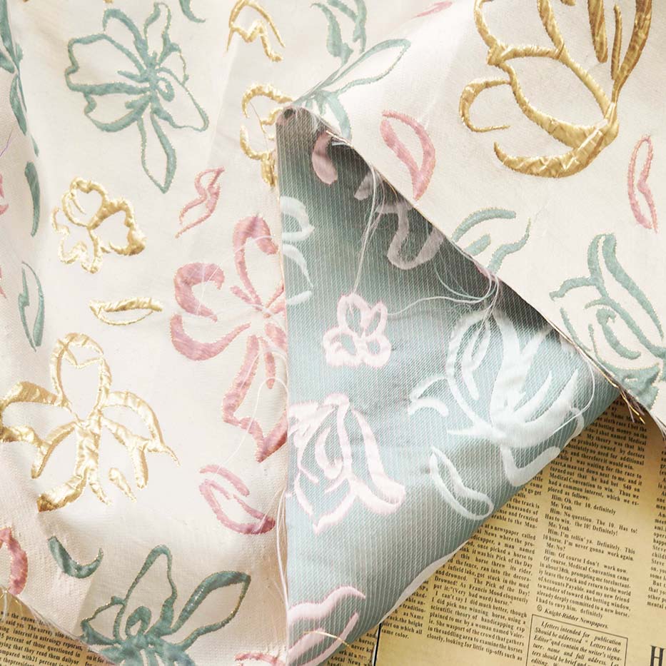 In summary, flower gold embossed jacquard brocade fabric offers a combination of floral elegance and luxurious gold accents, creating a fabric that is both visually striking and opulent. Its textured surface and exquisite design make it a popular choice for creating high-end garments and decor items that demand attention and evoke a sense of luxury.