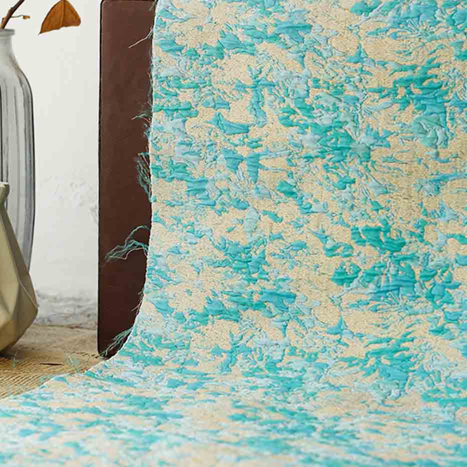This fabric is well-suited for creating elegant and attention-grabbing garments. It is often used for evening gowns, cocktail dresses, jackets, and other formalwear. The combination of the golden base, glacier blue accents, and embossed pattern makes it ideal for special occasions and events where a touch of luxury and sophistication is desired.