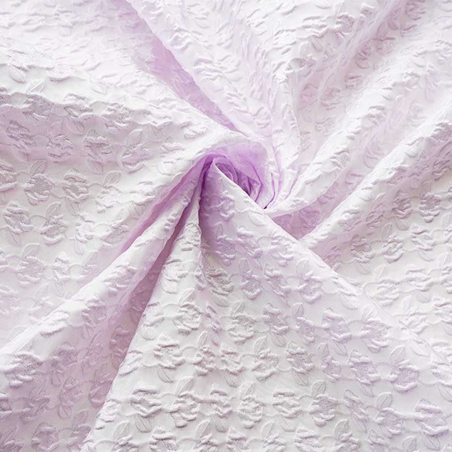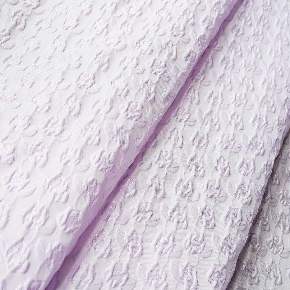 Lavender Embossed Small Floral Jacquard Brocade fabric is a beautiful and textured fabric that combines the elegance of jacquard brocade weaving with a delicate lavender color and small embossed floral motifs. Here's a description of this fabric: