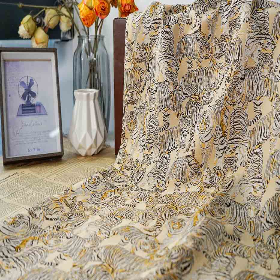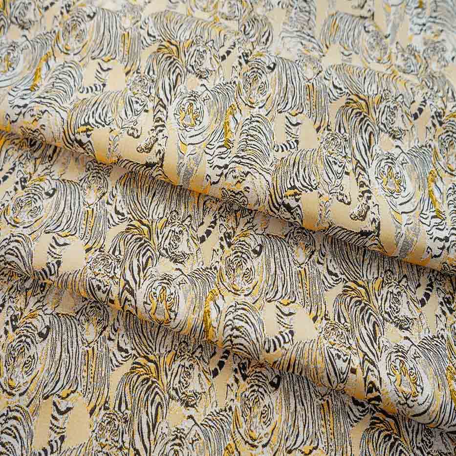 New Fashion Domineering Tiger Jacquard Brocade Fabric is a striking and attention-grabbing material that can elevate any fashion or interior design project. Its combination of the jacquard weave technique and the dominant tiger pattern creates a visually stunning and luxurious fabric option.