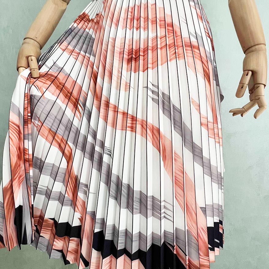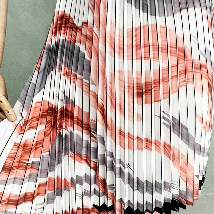 Application: Striped printed pleated fabric finds applications in both fashion and home decor. In fashion, it can be used to create skirts, dresses, tops, jumpsuits, or accessories like scarves or headbands. The combination of pleats and stripes adds visual interest, movement, and texture to the garments. In home decor, striped printed pleated fabric can be used for curtains, pillow covers, tablecloths, or other decorative accents, introducing a dynamic and stylish element to the space.