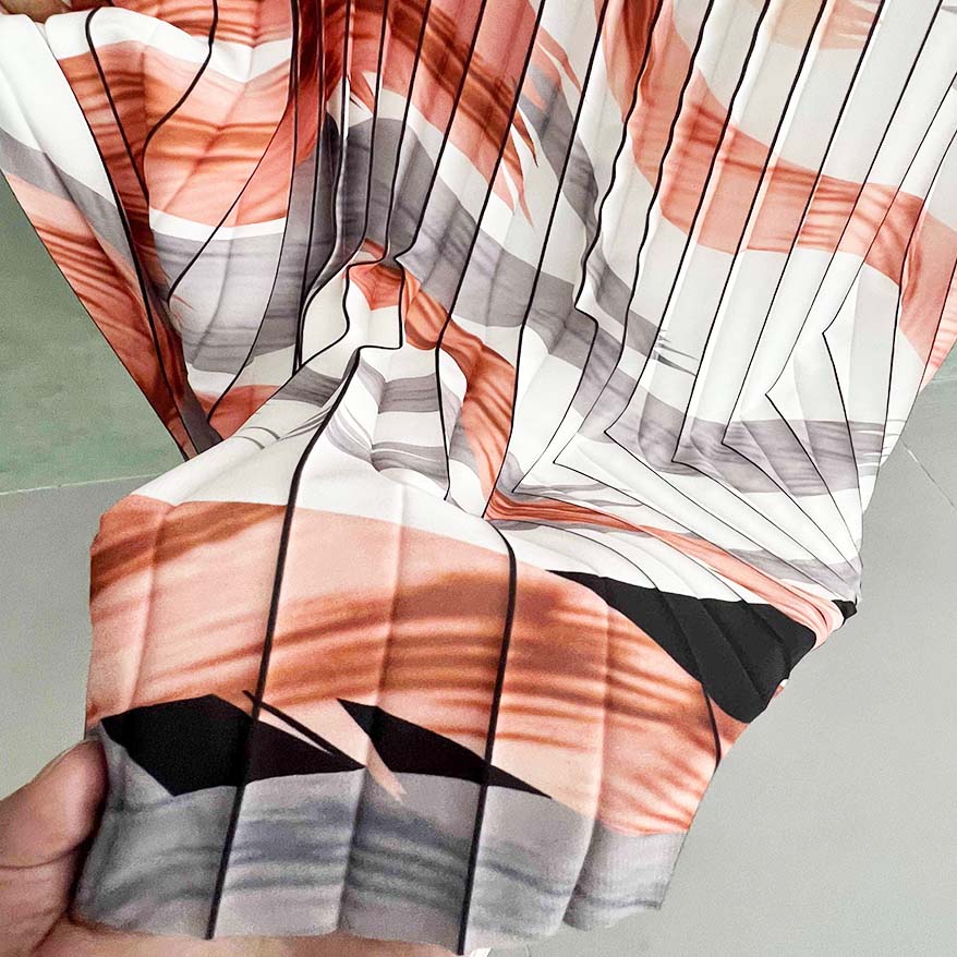 Pleating Technique: Striped printed pleated fabric is created by applying pleating techniques to a fabric that already features a striped pattern. The pleats can be narrow or wide, depending on the desired effect, and they are formed by folding and securing the fabric in place.