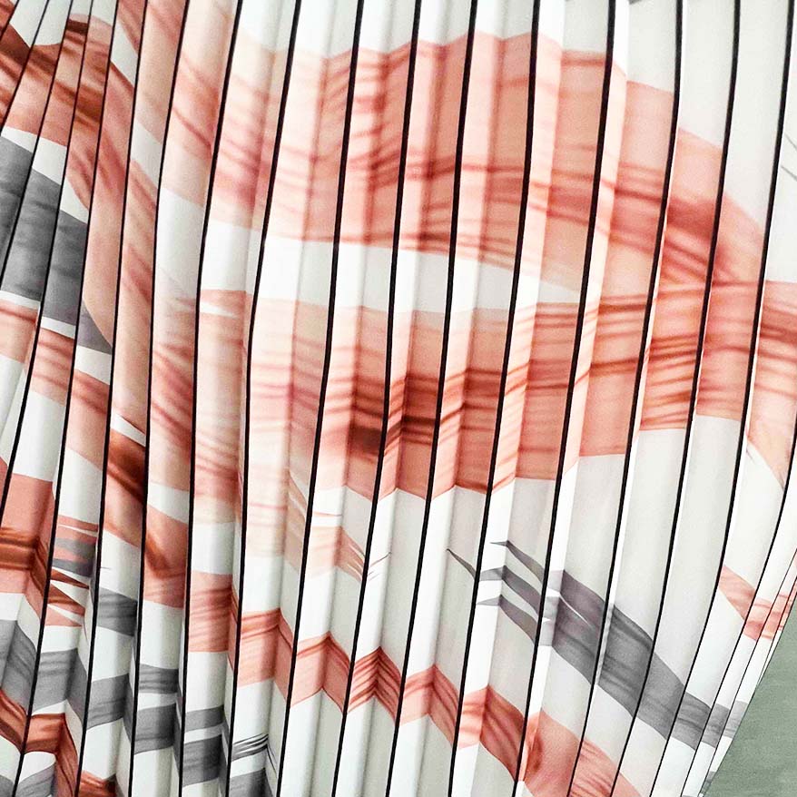 Fabric Types: Striped printed pleated fabric can be made from various types of materials, such as cotton, polyester, silk, or other lightweight fabrics. The choice of fabric can impact the drape, sheen, and overall look of the pleated fabric.