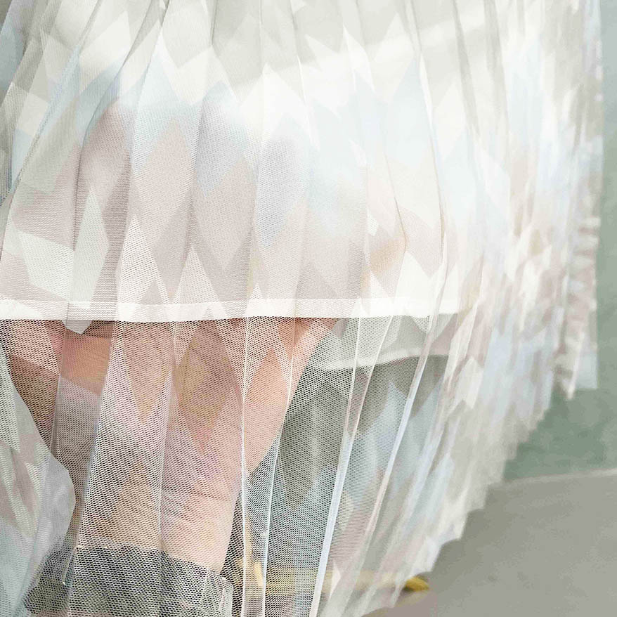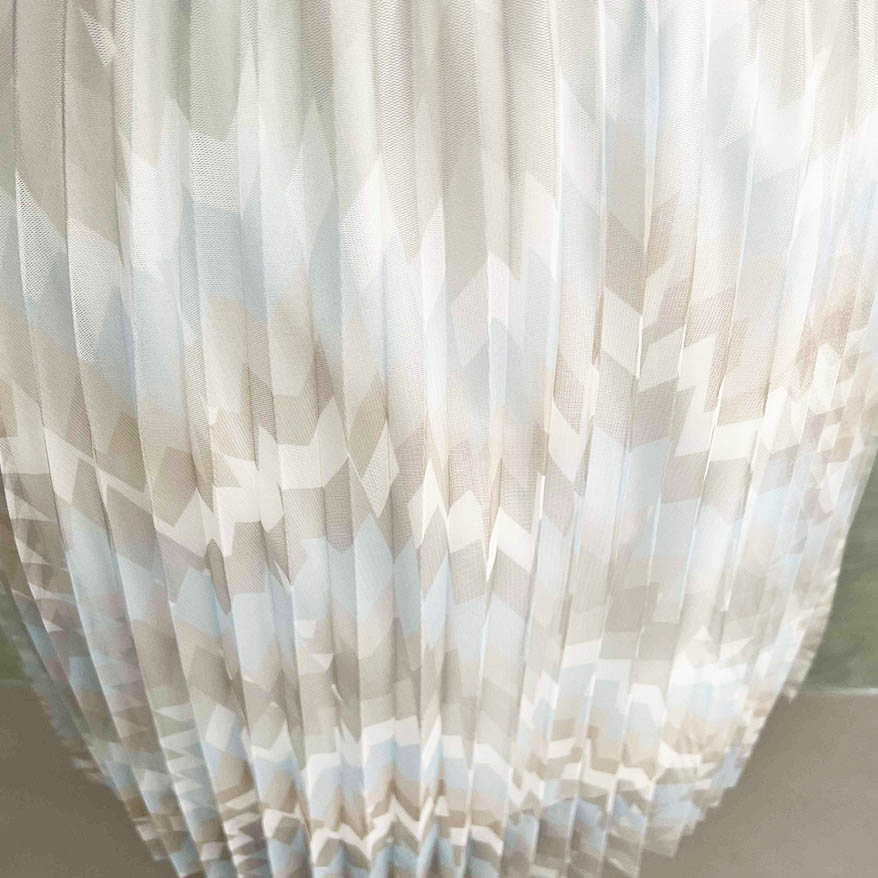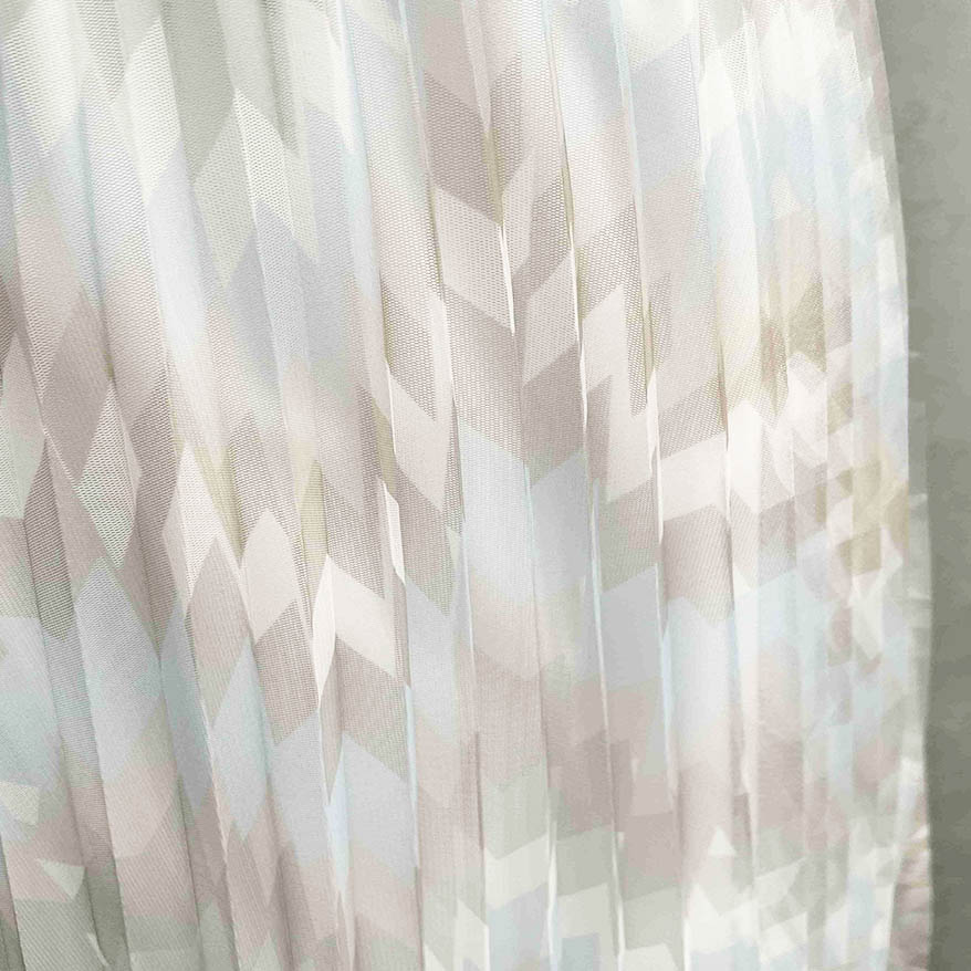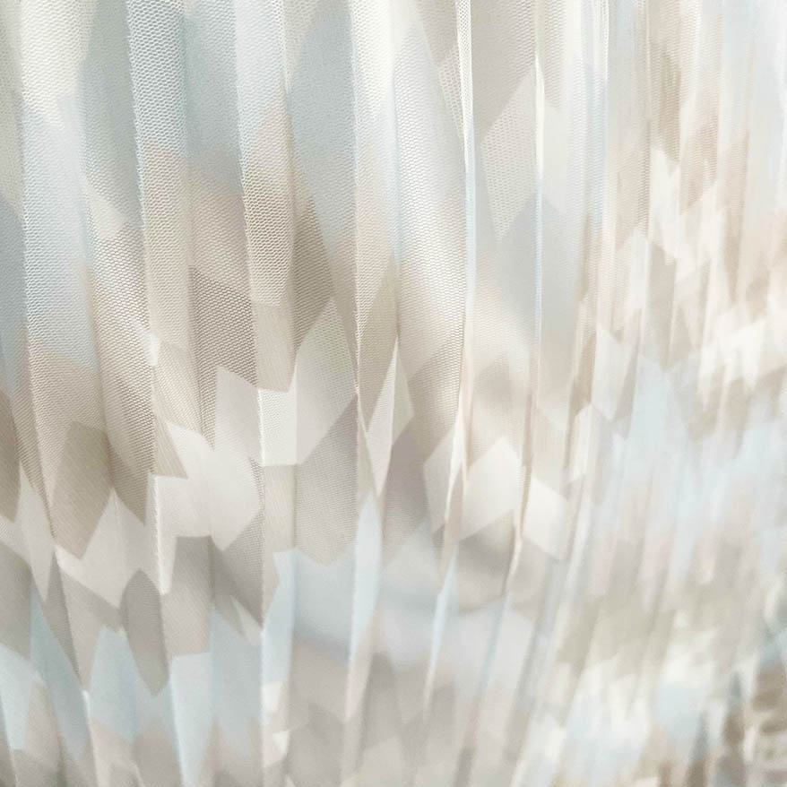 Pleated: The fabric incorporates pleating techniques, creating permanent creases or folds within the mesh material. Pleating adds dimension, texture, and structure to the fabric, resulting in a visually interesting and dynamic surface.