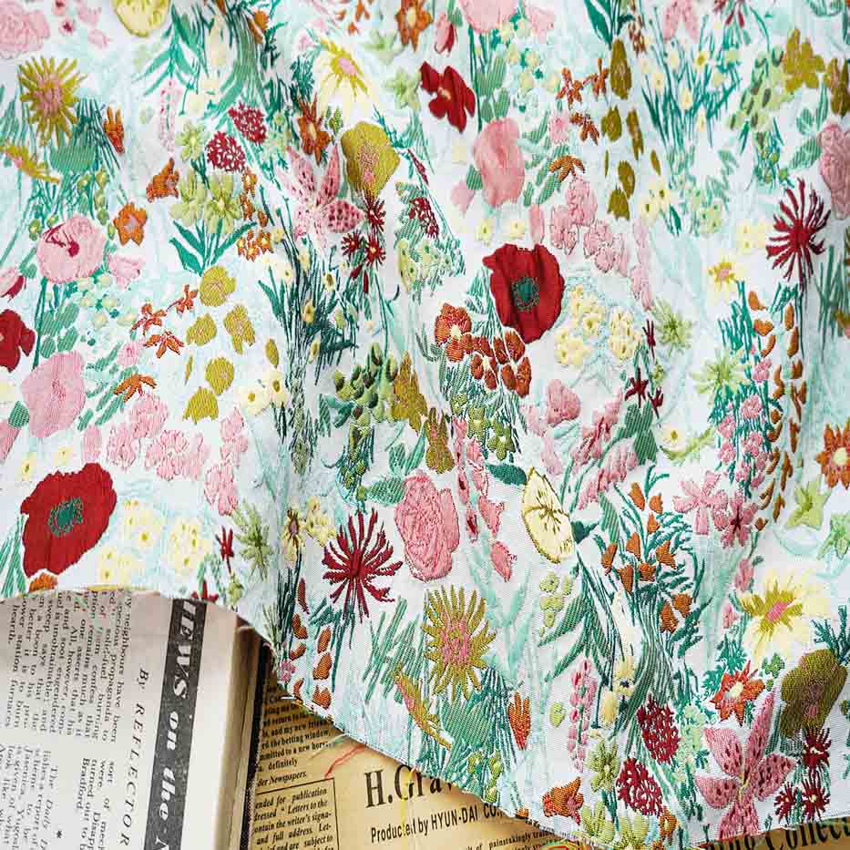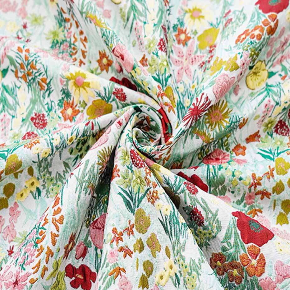 Floral jacquard brocade fabric is a beautiful and elegant textile that features intricate woven patterns, often with a raised texture. It is a popular choice for creating stylish and luxurious garments, home decor items, and accessories.