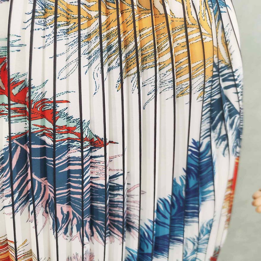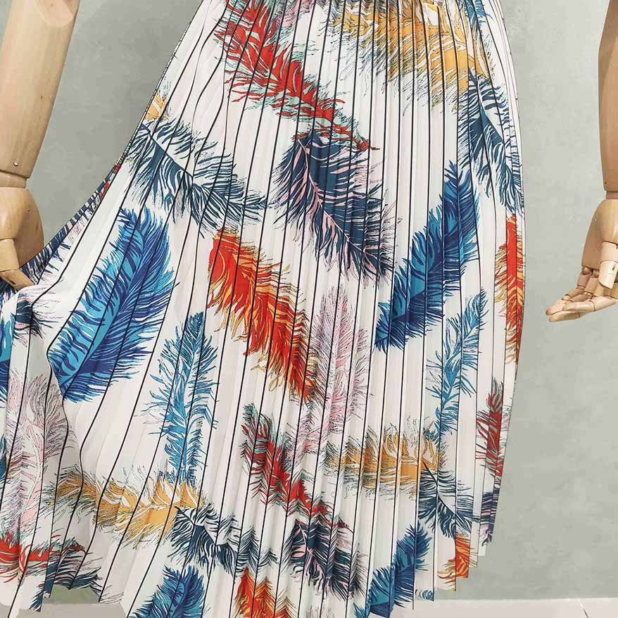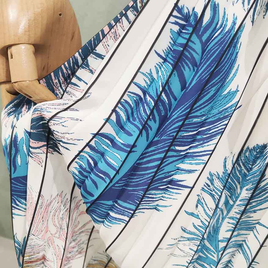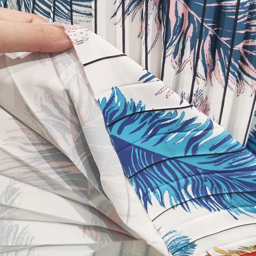 Pleating: Pleating involves the folding and creasing of fabric to create small, regular folds or ridges. In the case of trendy colorful feather printed chiffon pleated fabric, the chiffon material undergoes the pleating process. The pleats can be evenly spaced and can run horizontally or vertically across the fabric, adding texture and depth to the overall design.