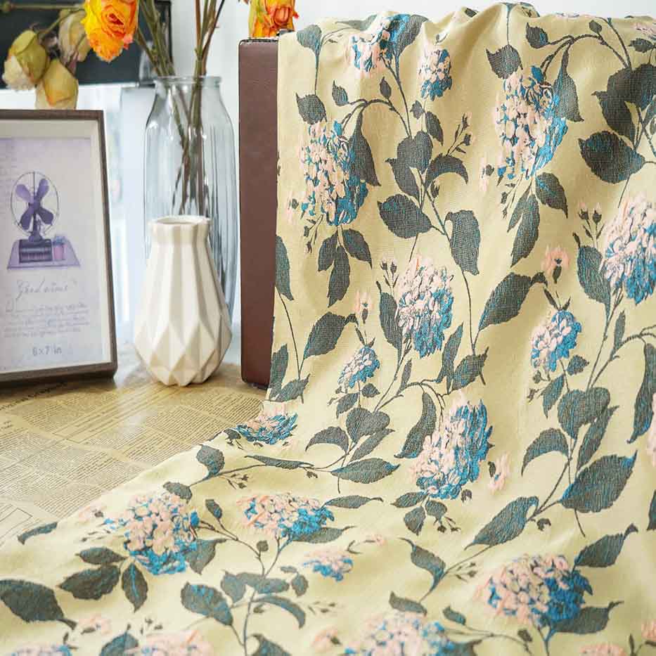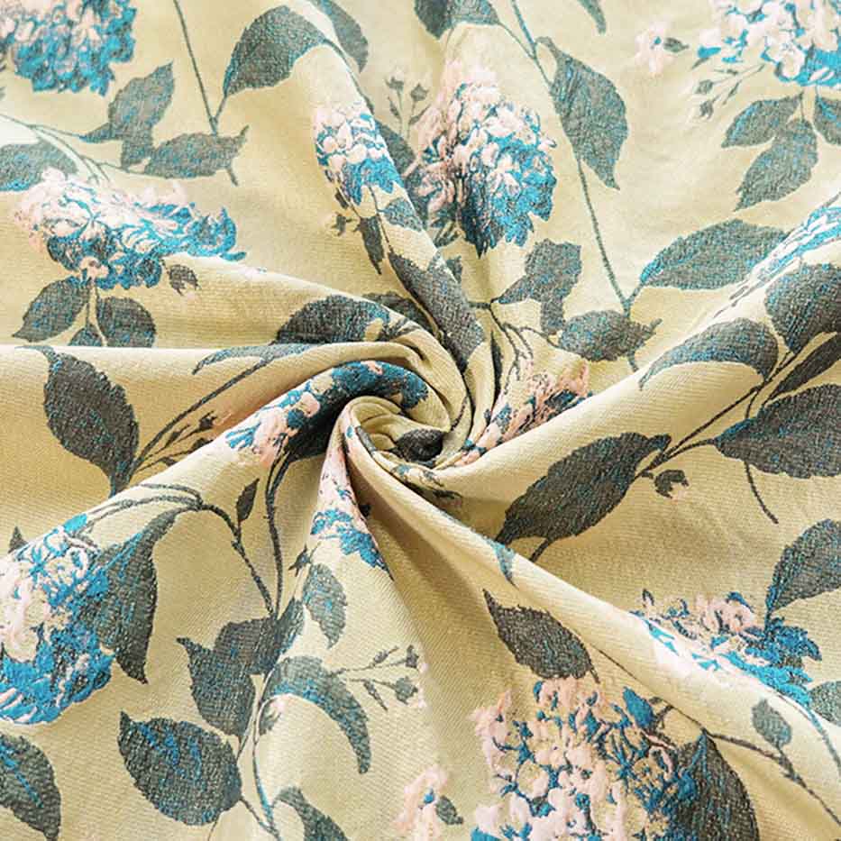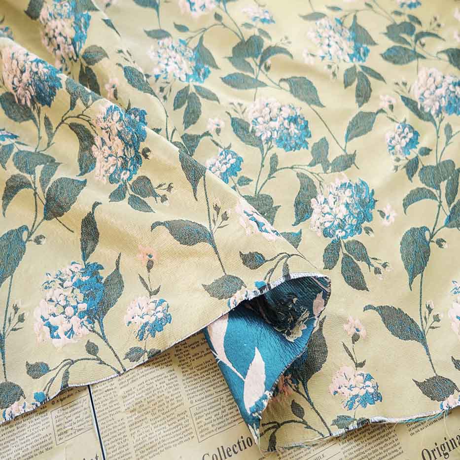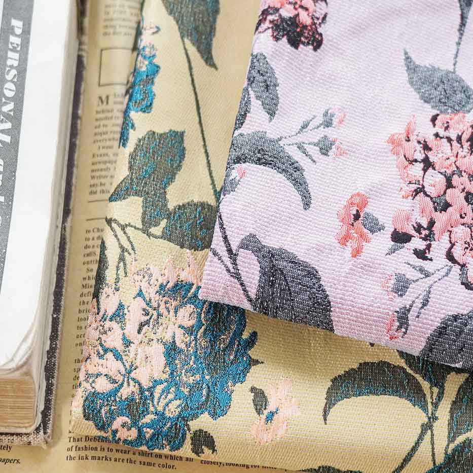 This fabric features a beautiful color block floral design, made using the jacquard weaving technique. This technique allows for intricate and detailed patterns to be created by controlling individual warp threads. The jacquard loom weaves different colors and patterns into the fabric, producing a rich and textured surface. rich and textured surface.